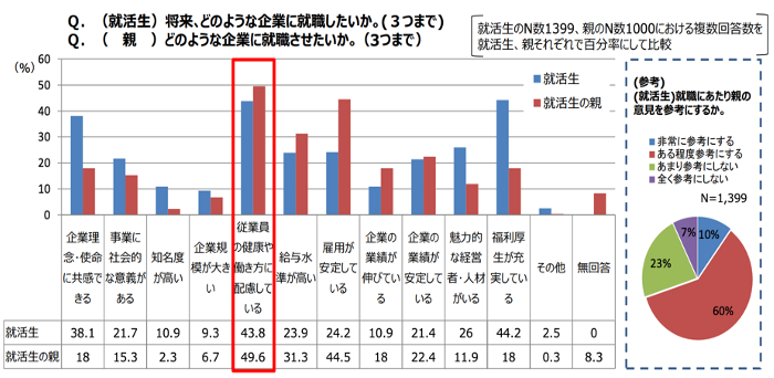 経済産業省のアンケートによると、数年前は給料水準や業績の安定性が重視されていましたが、近年はメンタルヘルスへの配慮や働き方、福利厚生を重視する学生が増加しています。さらに、就活生の約8割が親の意見を参考にしており、その親も健康面や働き方に配慮した企業を希望する傾向にあります(下図参照)。