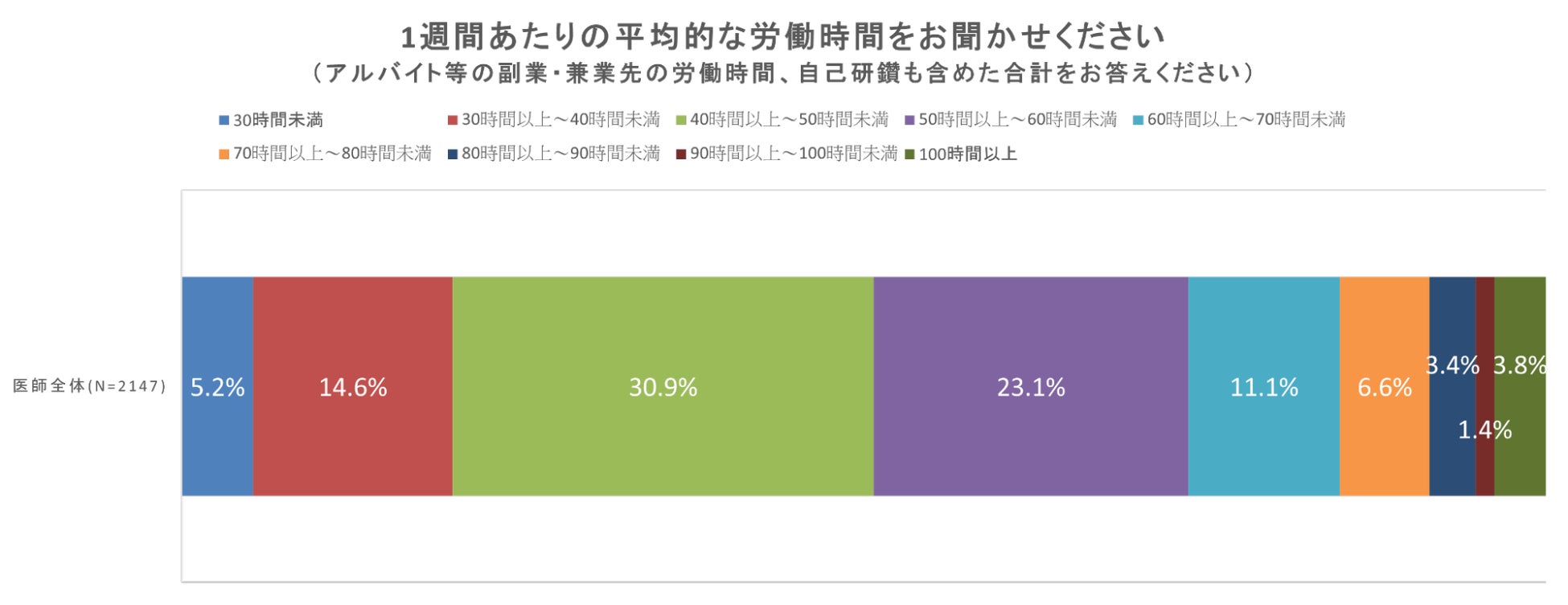 医師の1週間あたりの平均的な労働時間の調査結果はこのようになりました。