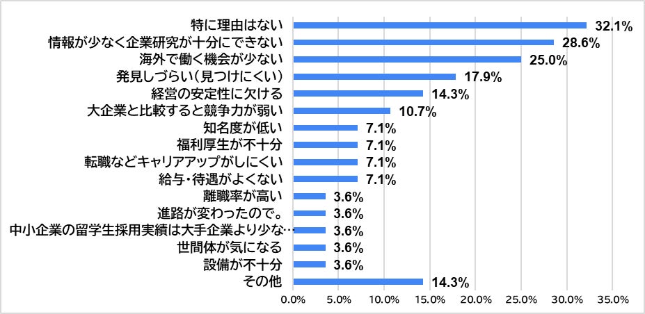 最も多かったのが、「特に理由はない」9名(32.1%)、次いで「情報が少なく企業研究が十分にできない」8名(28.6%)で、「海外で働く機会が少ない」7名(25.0%)、「発見しづらい(見つけにくい)」5名(17.9%)。
