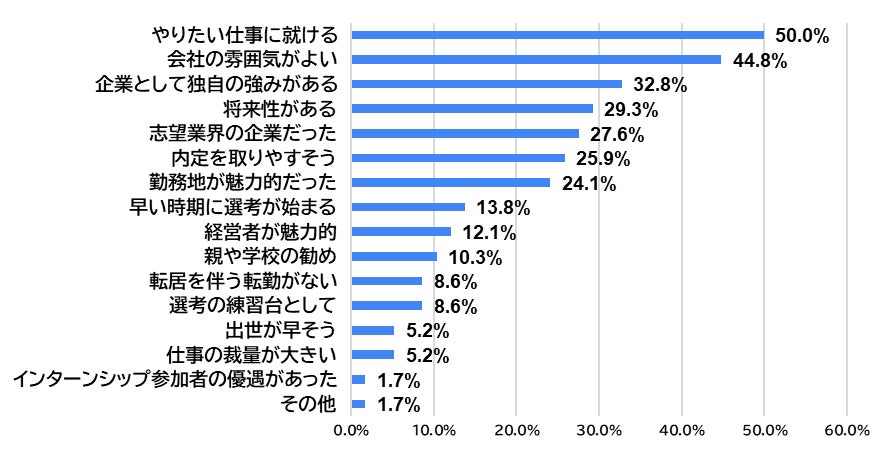 最も多かったのが「やりたい仕事に就ける」29名(50.0%)、次いで「会社の雰囲気がよい」26名(44.8%)、「企業として独自の強みがある」19名(32.8%)。