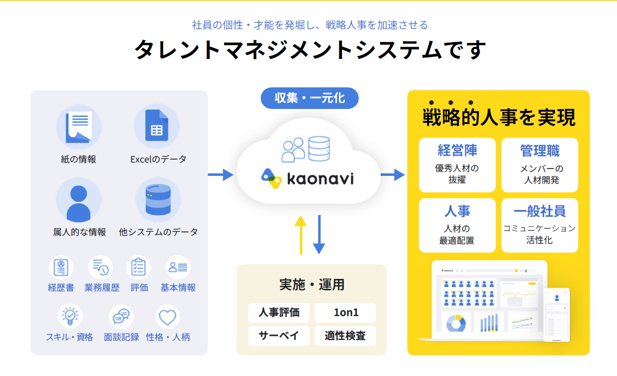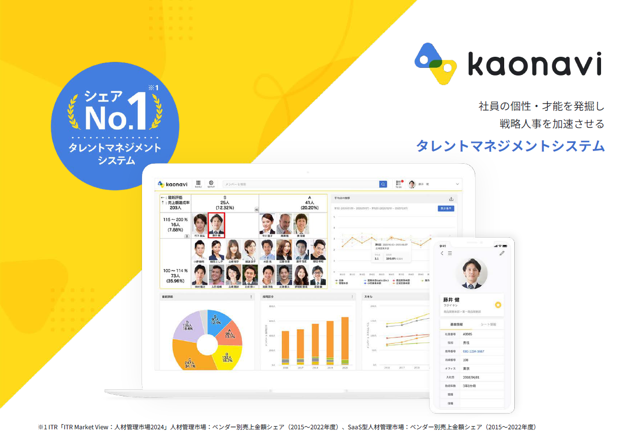 株式会社カオナビが提供する「カオナビ」は、社員情報を一元管理し、個々の力を最大限に引き出すタレントマネジメントシステムです。