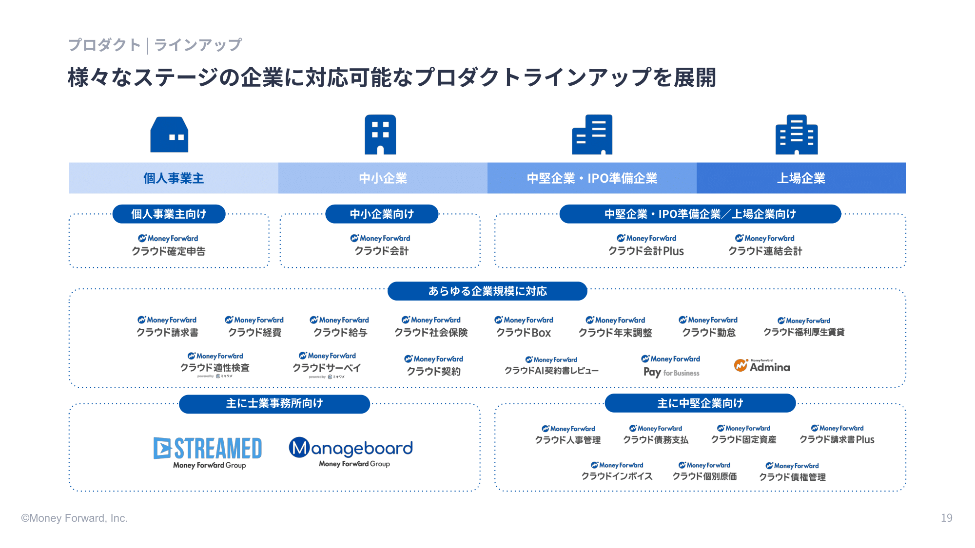 「マネーフォワード クラウド」は、個人事業主から中小企業、中堅企業・IPO準備企業、上場企業まで、あらゆる規模の企業のバックオフィス業務を効率化するためのサービス群です。