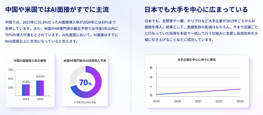 従来のAI面接ツールとは異なり、まるで人間と話しているかのようなスムーズなコミュニケーションを通じて、応募者の本音や潜在的な能力を引き出します。